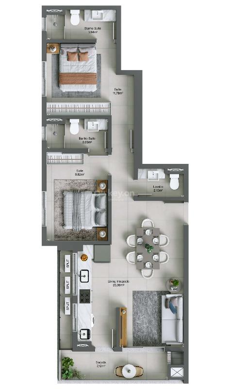 Apartamentos: 1 ou 2 suítes, com ou sem lavabo, de 72m² a 78m² de área privativa;