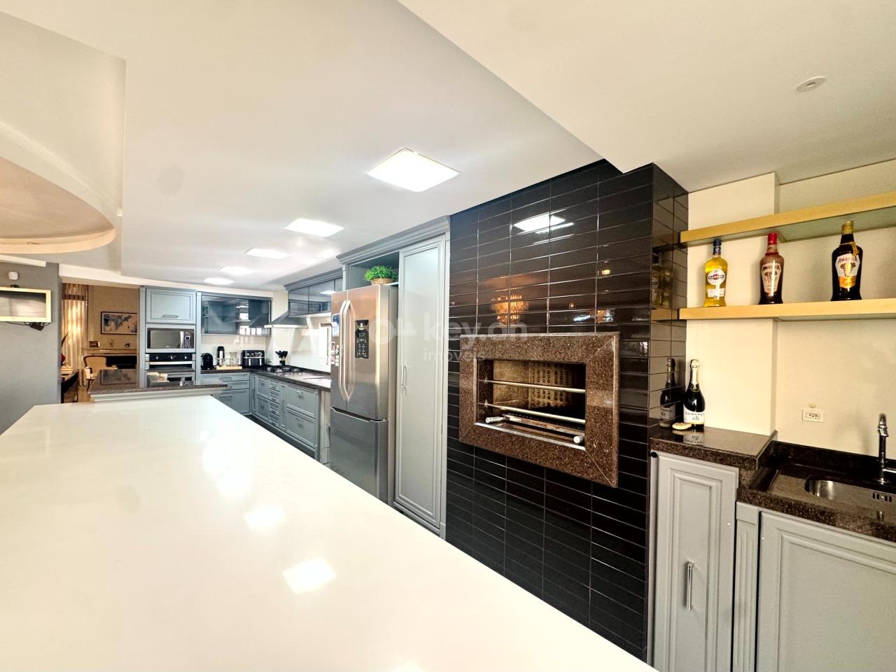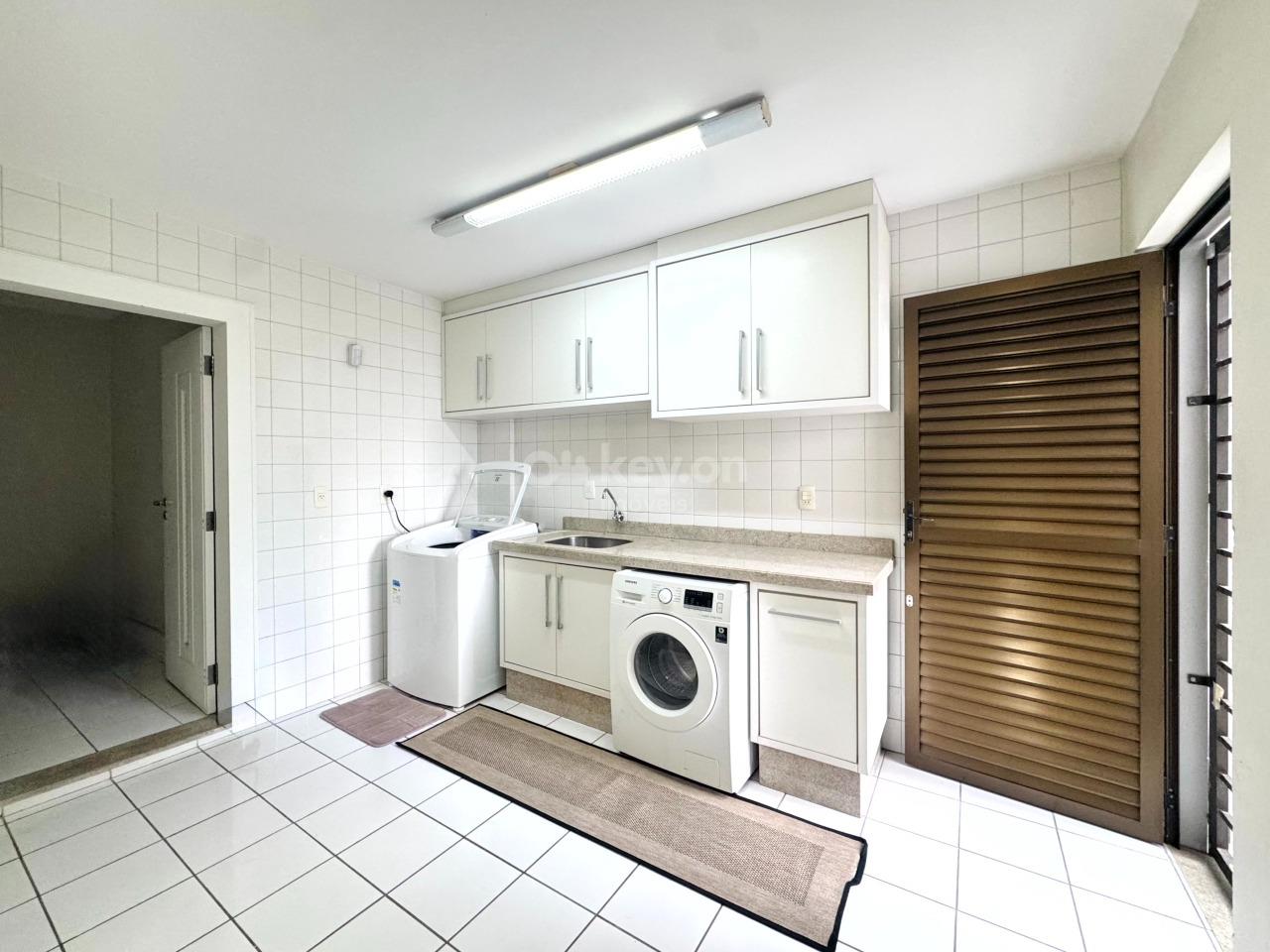 A garagem acomoda até 4 carros, com duas despensas, lavanderia ampla e banheiro de apoio.