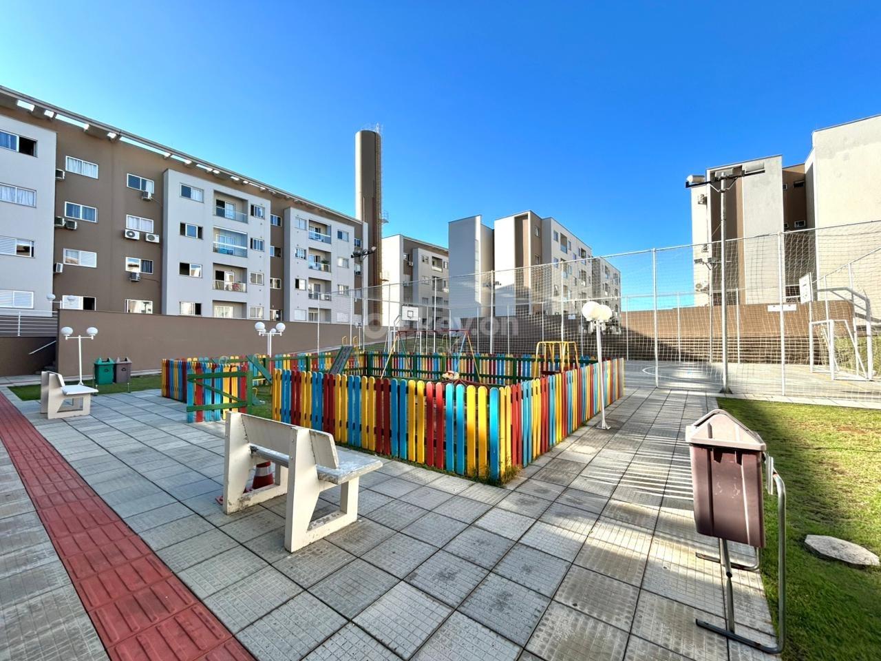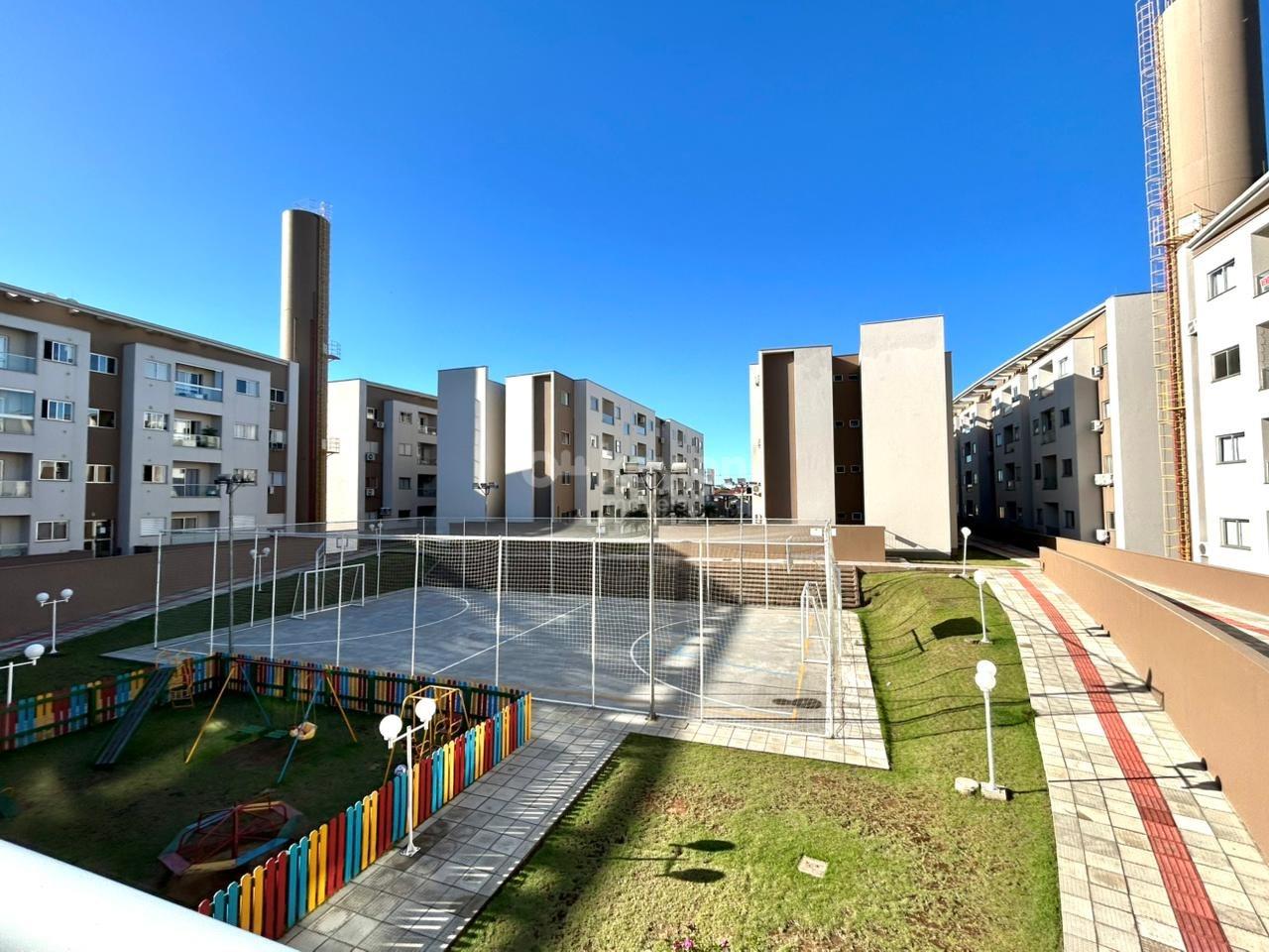 Área de lazer com quadra poliesportiva, playground e salão de festas.